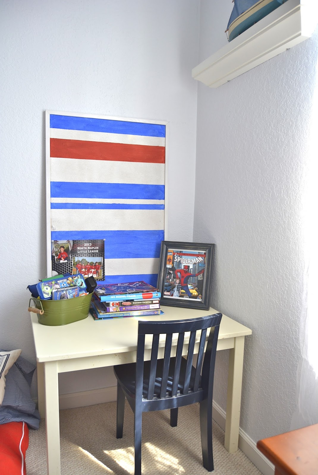 With our twins, there is always a yin & yang, tit-for-tat, Libra-esque thing going on from the second they wake up until their fuzzy towheads once again rest upon their dinosaur and ballerina pillows. In other words, AJ was jealous as all hell of his sister's brand new book nook. Little did he know that I'd already planned to create a 'schoolwork station' for him. (My efforts to convince him that our decision to update his digs was in no way a response to his fit of jealousy is a whole 'nother story.)